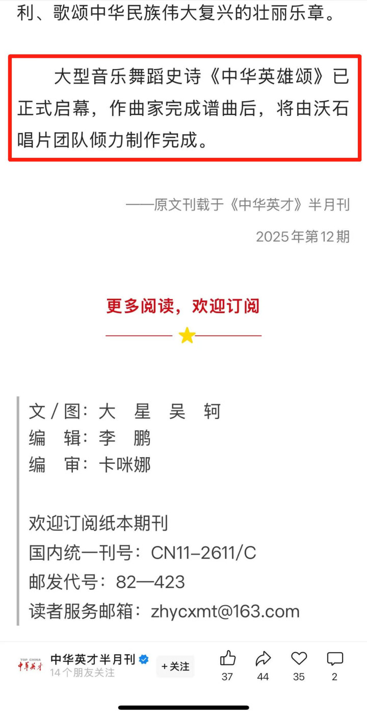 在《中华英才》半月刊2025年第12期的报道中,《中华英才》半月刊杂志社主办的大型音乐舞蹈史诗《中华英雄颂》已正式启幕,作曲家完成谱曲后,将由沃石唱片团队倾力制作完成。